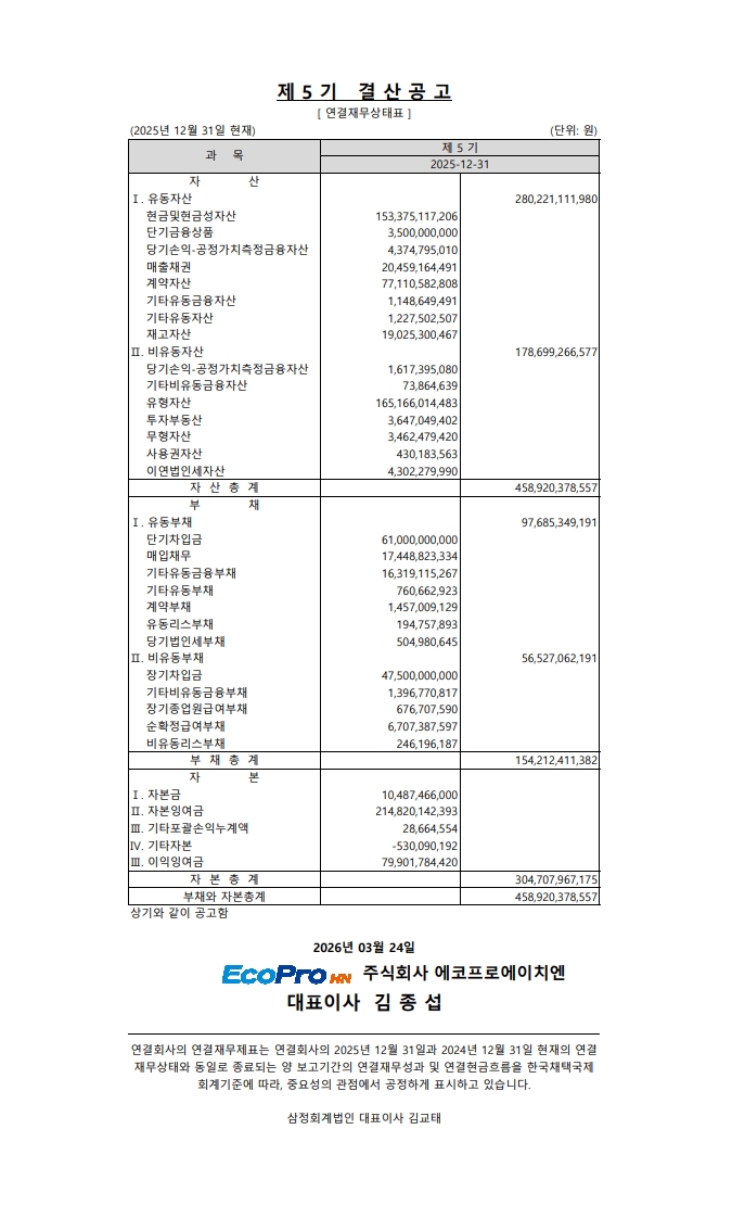 [공고] 에코프로에이치엔 제5기 결산공고 2026.03.24 다운로드.zip 에코프로에이치엔_제5기_결산_공고_별도.jpg (260.8 KB)에코프로에이치엔_제5기_결산_공고_연결.jpg (263.2 KB) 목록보기