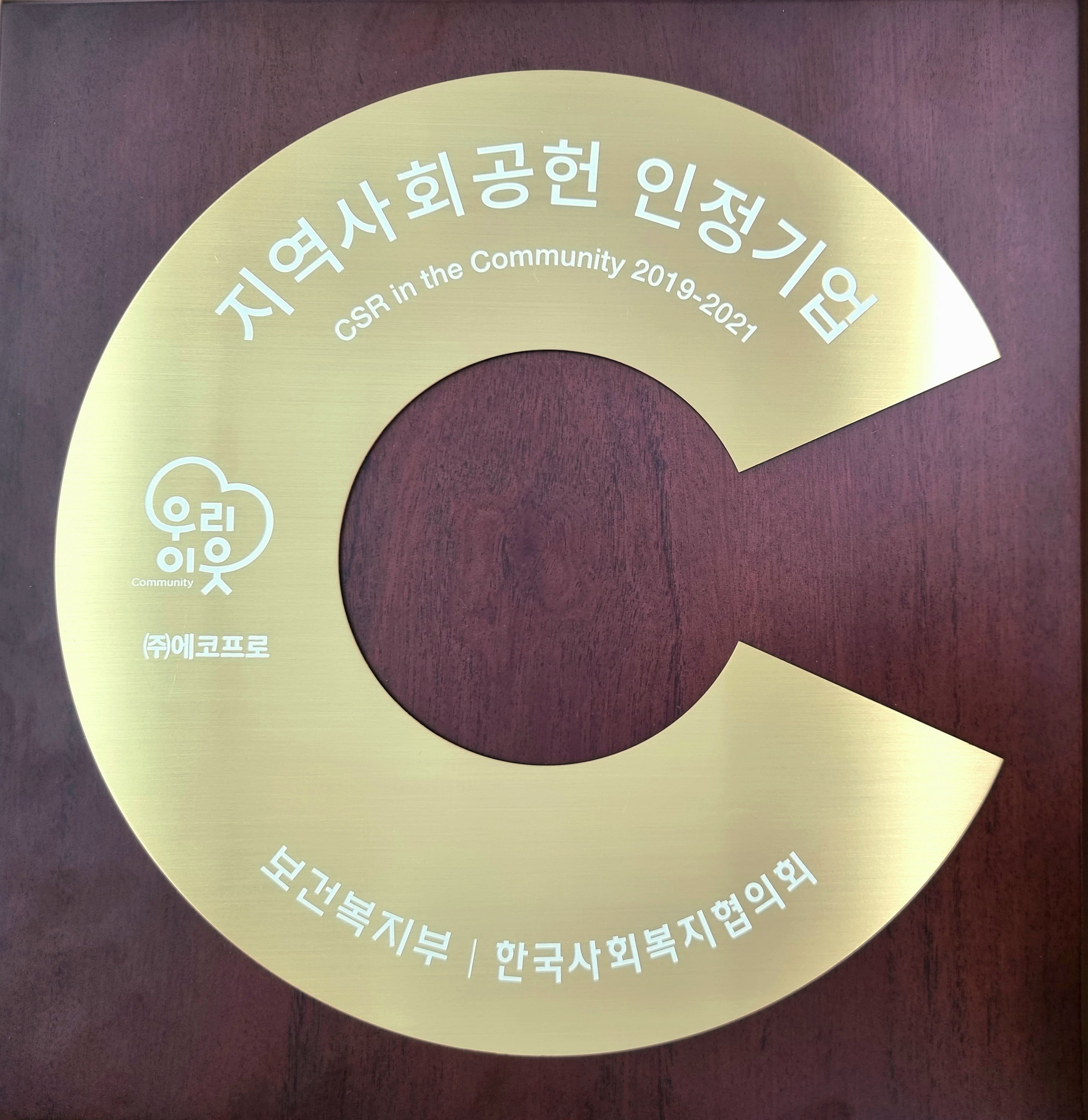 에코프로는 2021년 12월 3일 보건복지부 주최 ‘지역사회공헌 인정의 날 ‘행사에서 지역사회공헌 공로를 인정 받아 지역사회공헌 인정기업으로 3년 연속 선정됐습니다.