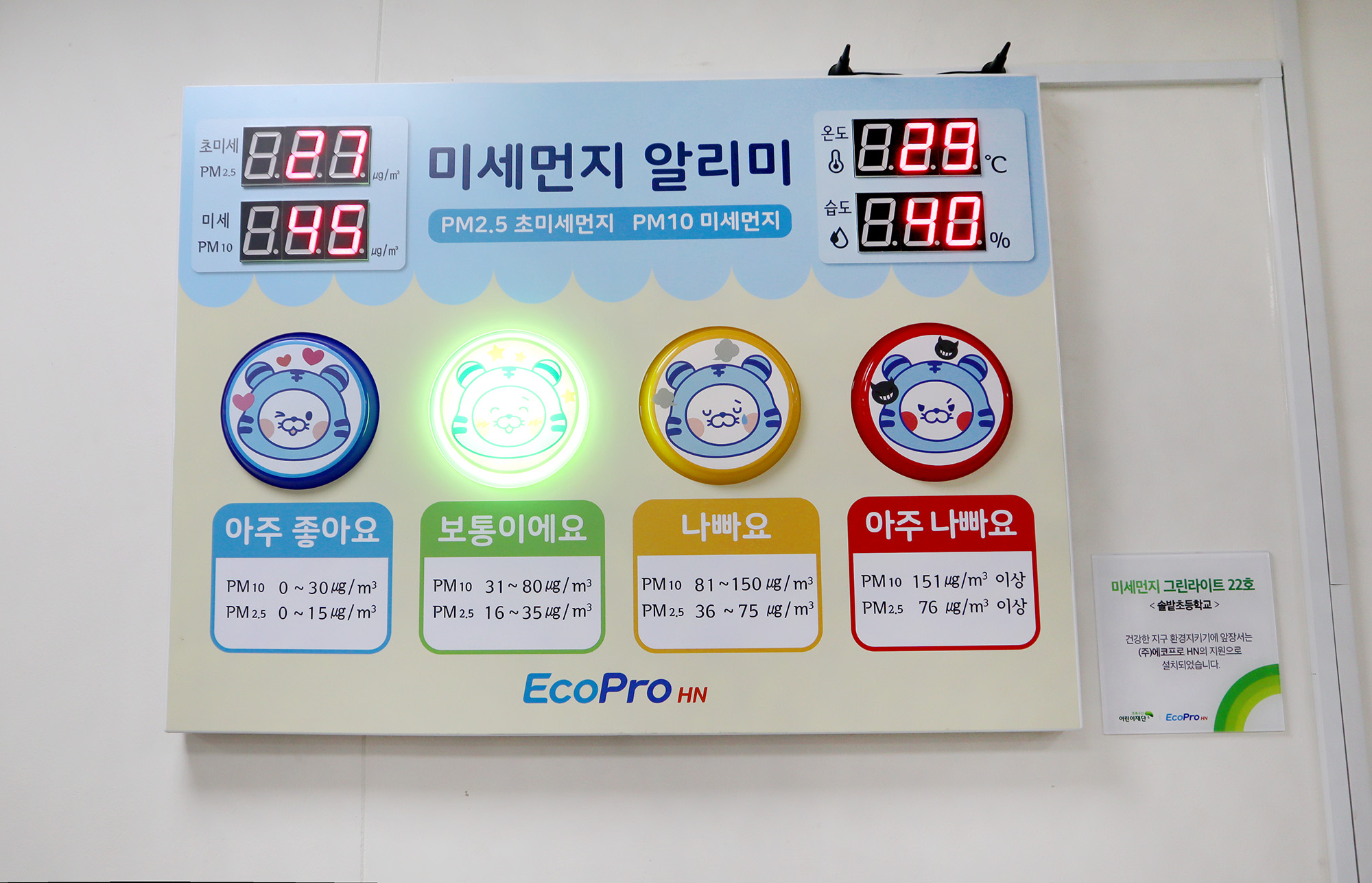 미세먼지 알림판 지원은 에코프로HN 환경사업 부문의 특성을 살린 사회 공헌 활동으로, 현재까지 25개교(어린이집 포함)에 설치되었습니다.