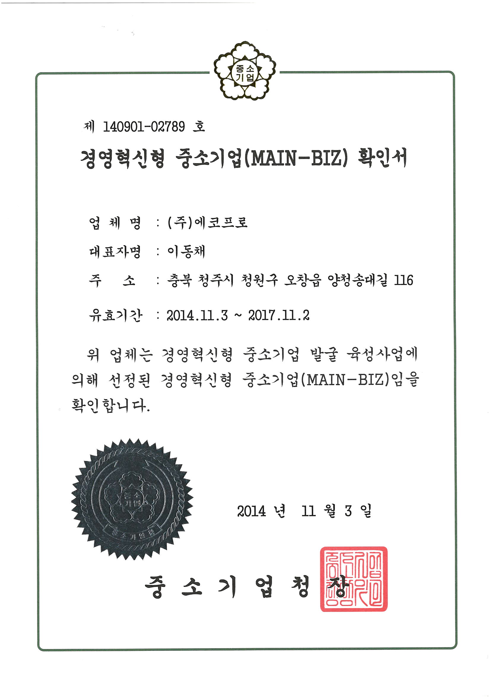 [안내] 경영혁신형 중소기업(Main Biz) 인증 2014.11.06 당사가 경영혁신활동을 통해 새로운 성장 동력을 갖춘 중소기업을 발굴하여 우수기업으로 육성하기 위해 중소기업청에서 인증하는 경영혁신형 중소기업 (Main-biz)에 인증되었음을 알려드립니다.1. 인증기간 : 2014년 11월 3일 ~ 2017년 11월 2일2. 인증기관 : 중소기업청3. 인증서 목록보기