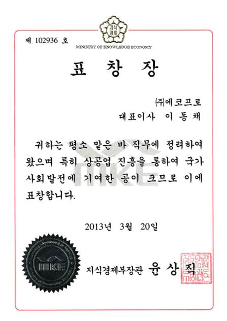 [안내] 지식경제부 장관상 수상 2013.03.20 에코프로 이동채 대표이사는 금일(3월 20일) 서울 코엑스 auditorium에서 개최한 제 40회 상공의 날 기념식에서, 국가 산업 진흥 및 사회 발전 등에 기여한 공로를 인정받아 지식경제부 장관상을 수상하였습니다. 1998년 창업 이래 세계에서 두번째로 양산에 성공한 "촉매식 PFC(과불화화합물) 온실가스 저감설비" 및 수입 의존도가 높아 대외 무역 역조 현상이 심각한 분야였던 "이차전지용 양극활물질"의 국산화 등에 대한 공로를 높게 인정받았습니다. 목록보기