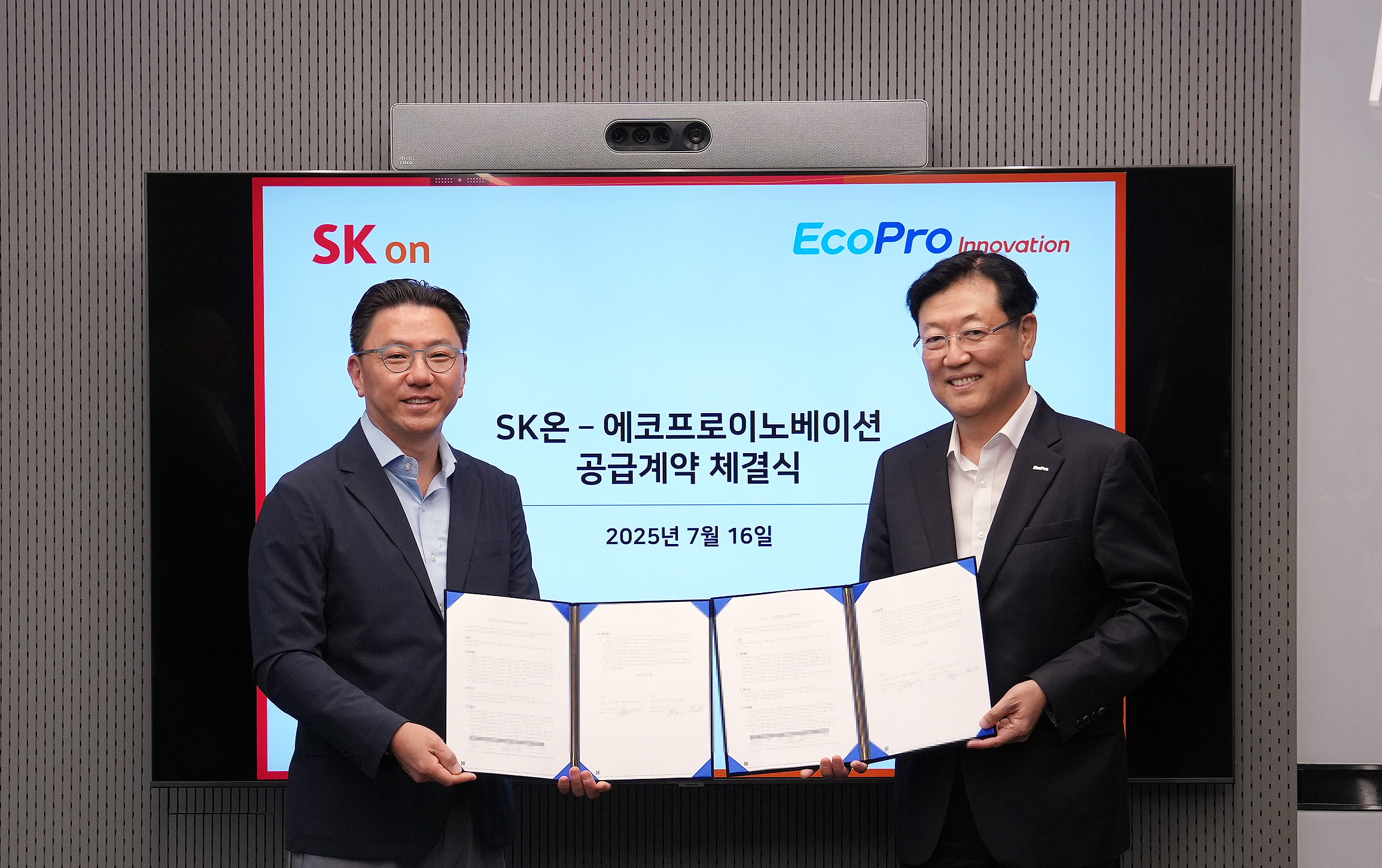 [사진설명 : 박종진 SK온 전략구매실장(좌측)과 김윤태 에코프로이노베이션 대표가 16일(수) 오전 서울 종로구 SK온 그린캠퍼스에서 수산화리튬 공급 계약 체결 후 기념 촬영에 임하고 있다.]