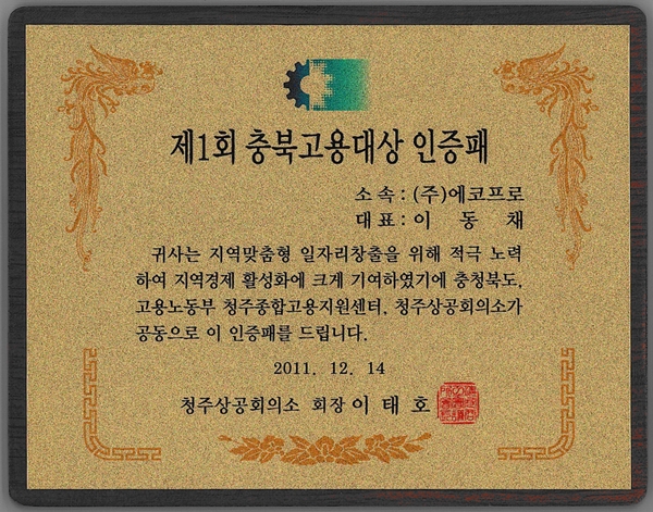 충북지역 내 지역 맞춤형 일자리 창출을 위해 노력하는 경영인을 위해 제1회 "충북고용대상 수상" 행사가 2011년 12월 14일에 충북상공회의소에서 개최되었습니다.