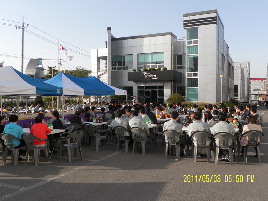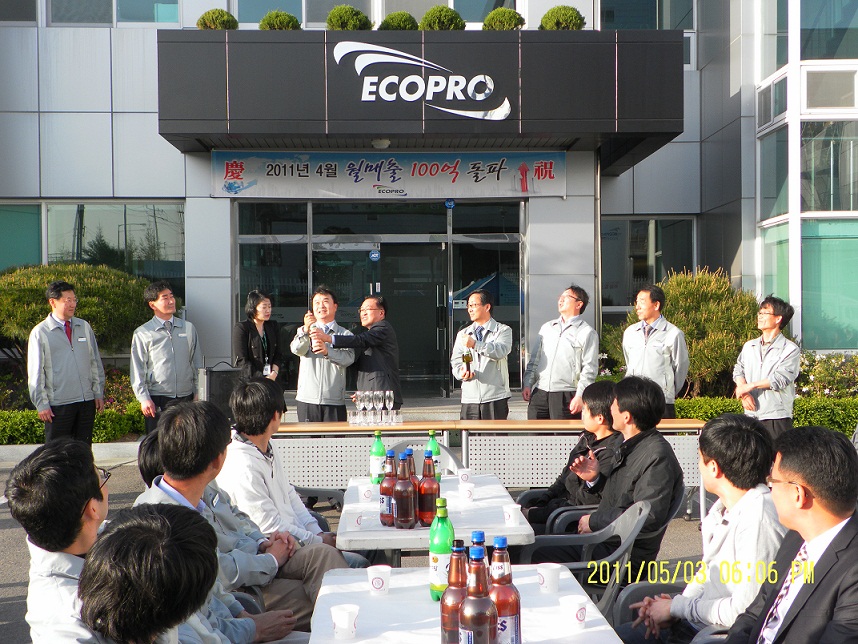 당사 주력 분야의 하나인 양극활물질 사업의 호조와 환경부문 실적 개선 등에 힘입어 1998년 10월 창립 이래 최초로 월 매출 100억(내부 잠정집계 기준 약 113억)을 초과 달성하여 에코프로 전직원들과 함께 조촐한 자축연을 실시하였습니다.