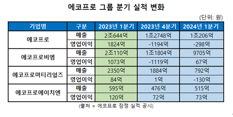 에코프로는 2024년 1분기 연결 기준 매출액이 전 분기 대비 20%가량 감소한 1조 206억 원을 기록했다고 3일 밝혔다. 1분기 영업손실은 재고자산 평가손실 충당금 일부를 환입하면서 지난해 4분기(-1194억 원) 대비 크게 줄어든 298억 원으로 집계됐다.