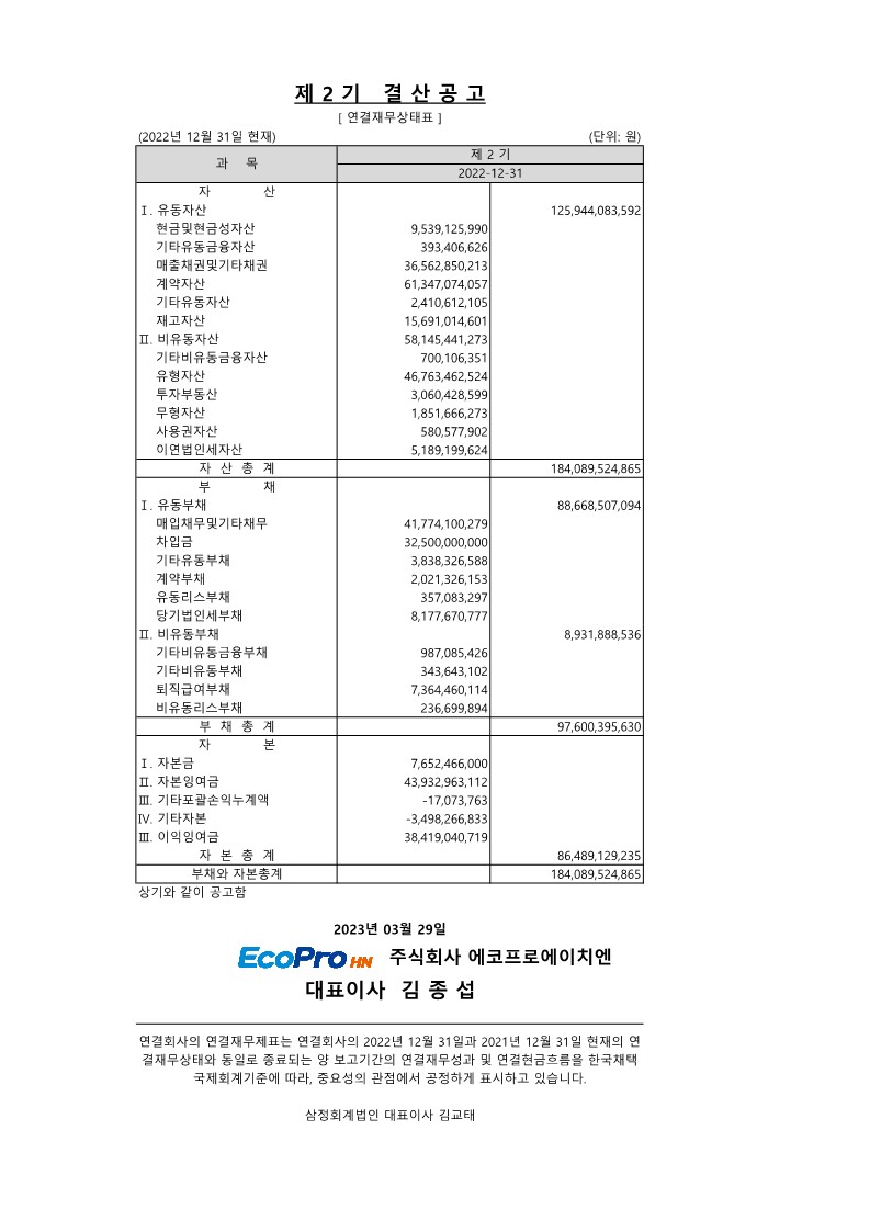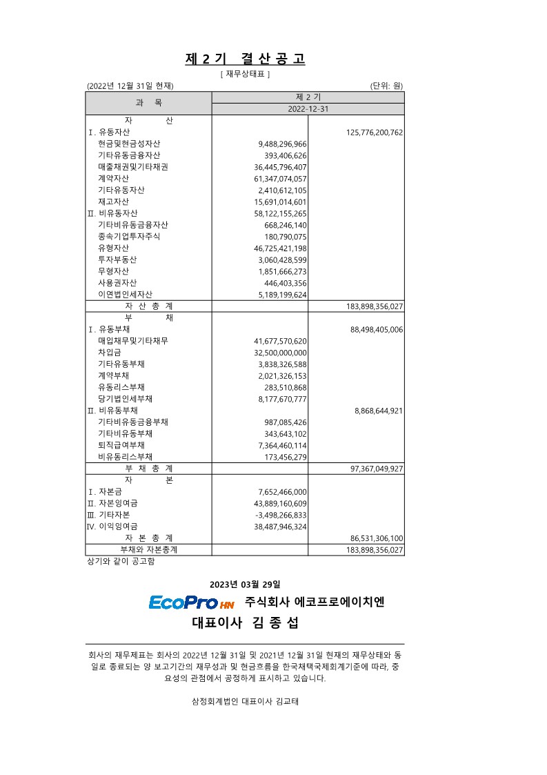 [공지] 에코프로에이치엔 제2기 결산공고 2023.03.29 다운로드.zip 에코프로에이치엔__제2기_결산_공고(연결).jpg (115.4 KB)에코프로에이치엔__제2기_결산_공고(별도).jpg (112.6 KB) 목록보기